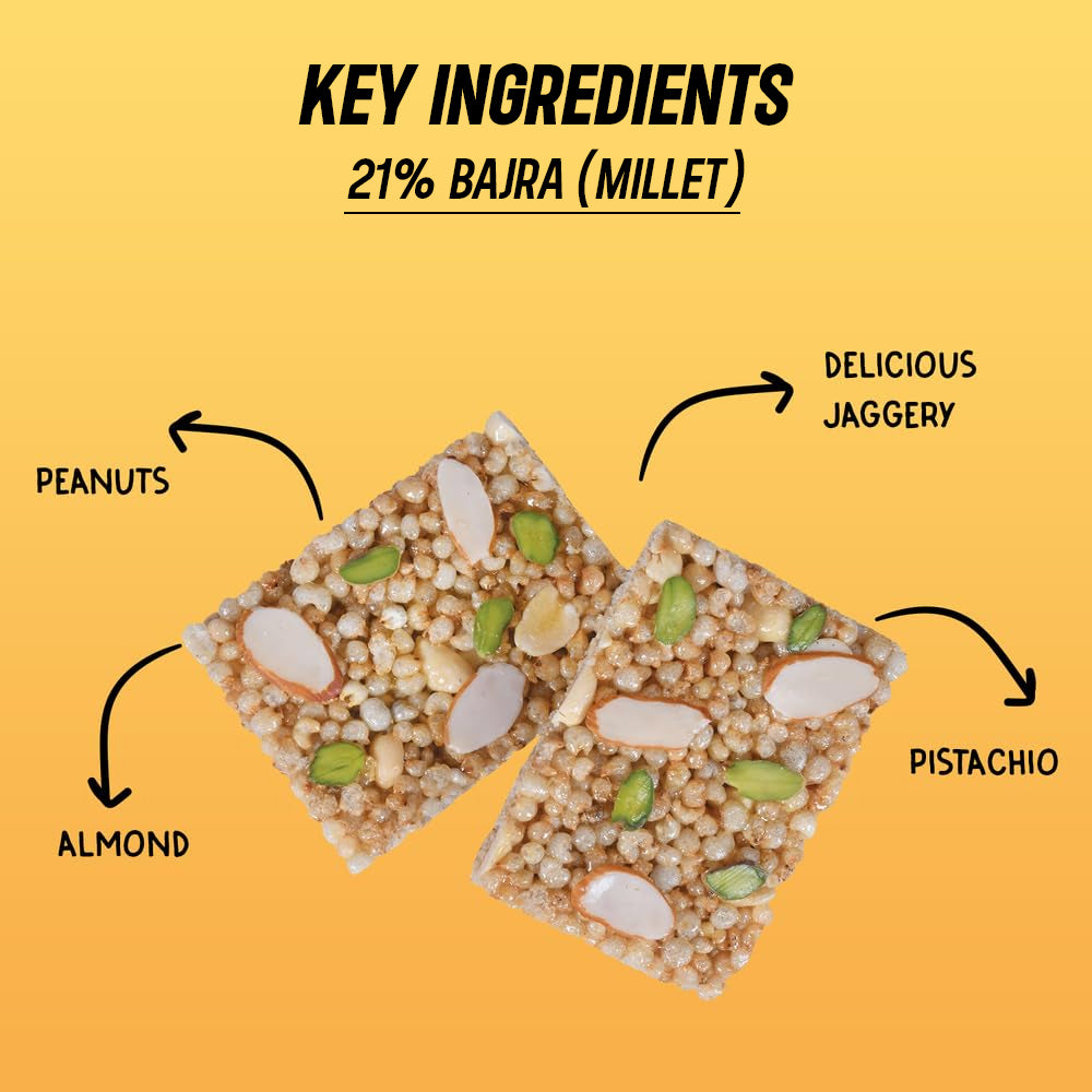 Nutrient-Rich Bajra Chikki: Indulge in the nutrient-rich goodness of Roasty Tasty's Quinoa Bars, packed with whole grains and enriched with dry fruits featuring a remarkable 21% content of bajra puffs