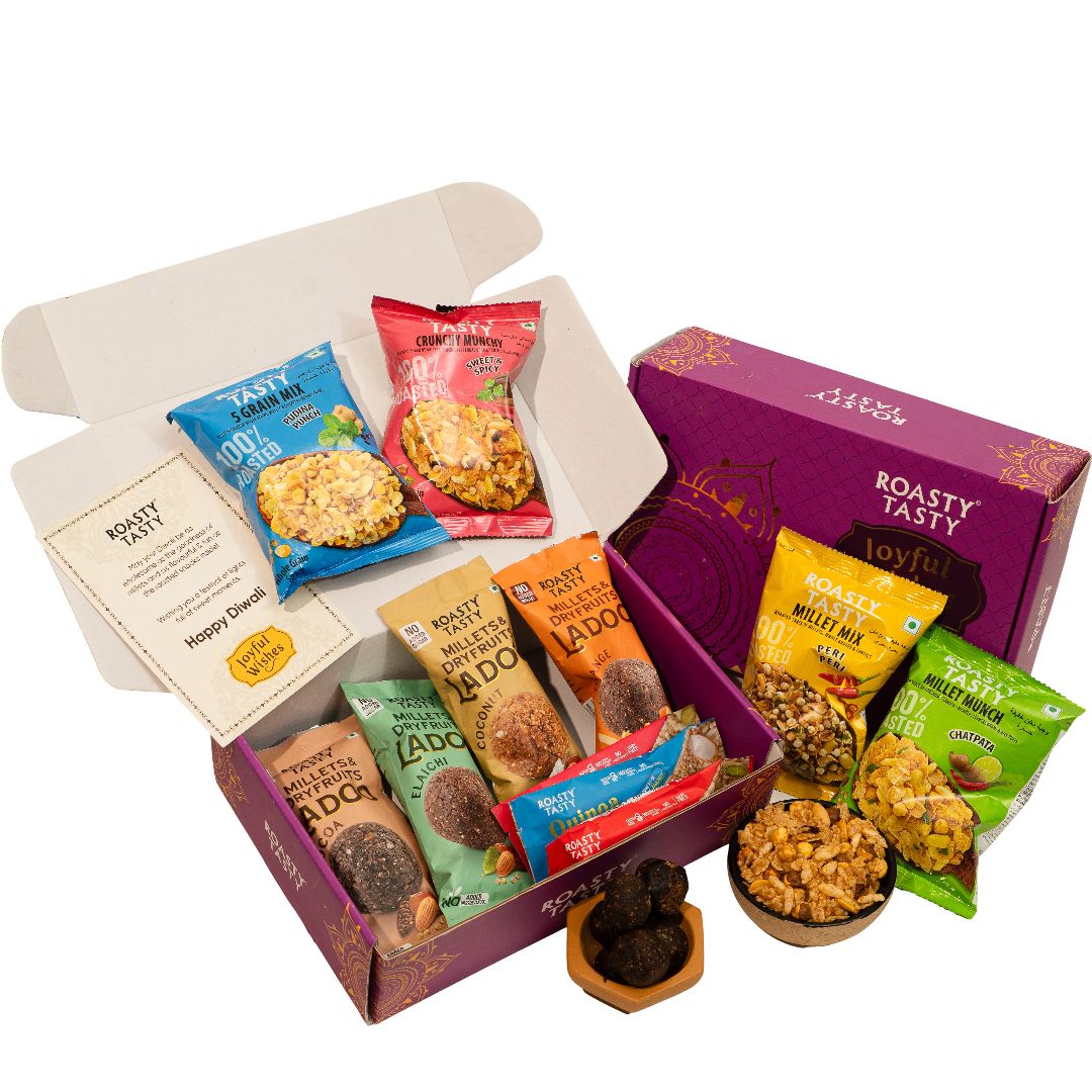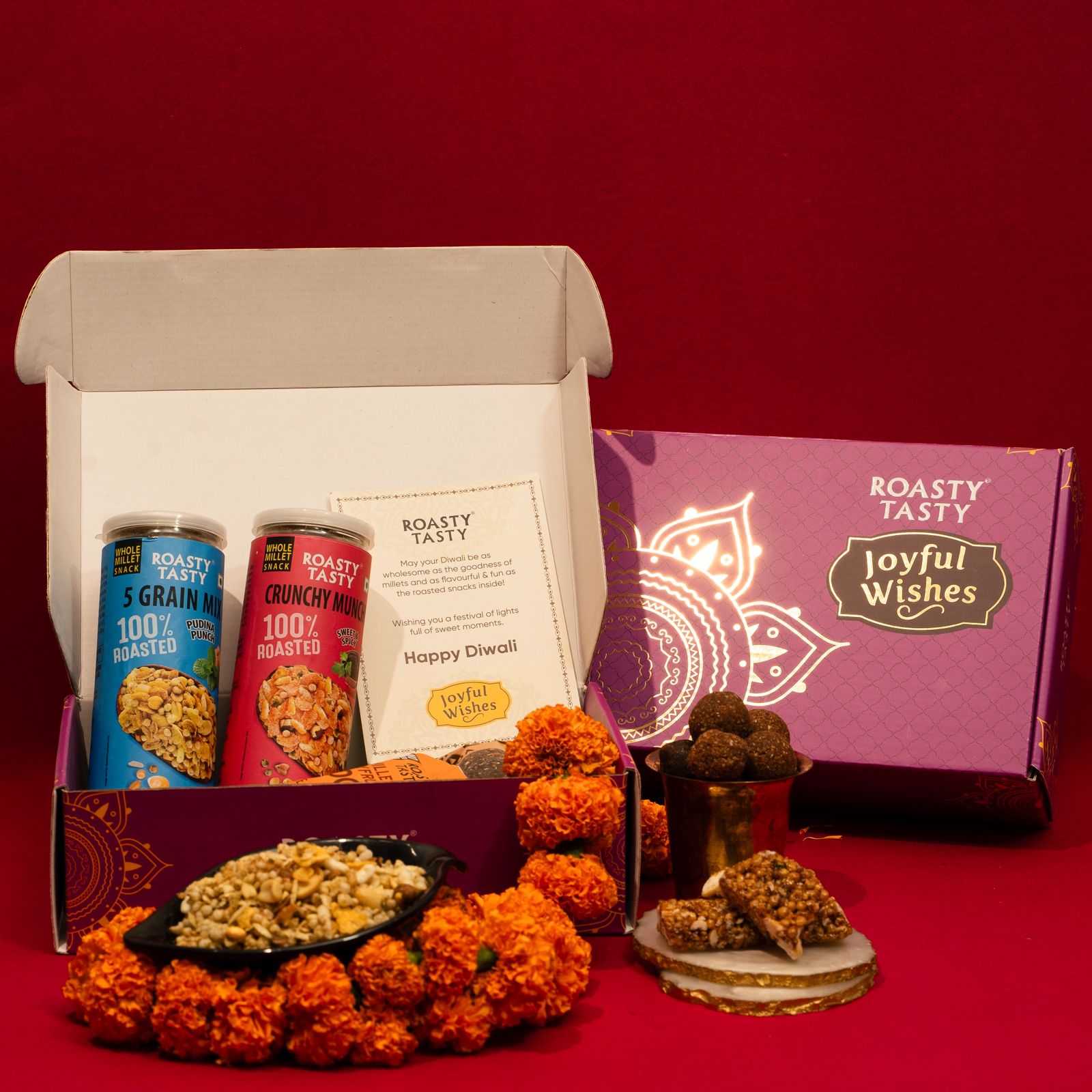 Delivering Pan - India within 7 to 10 Days. 7 Premium Inclusions - A festive hamper with 7 carefully chosen items including roasted millet snacks, no added sugar ladoos, & greeting card. Perfect Diwali gift for corporate & personal use