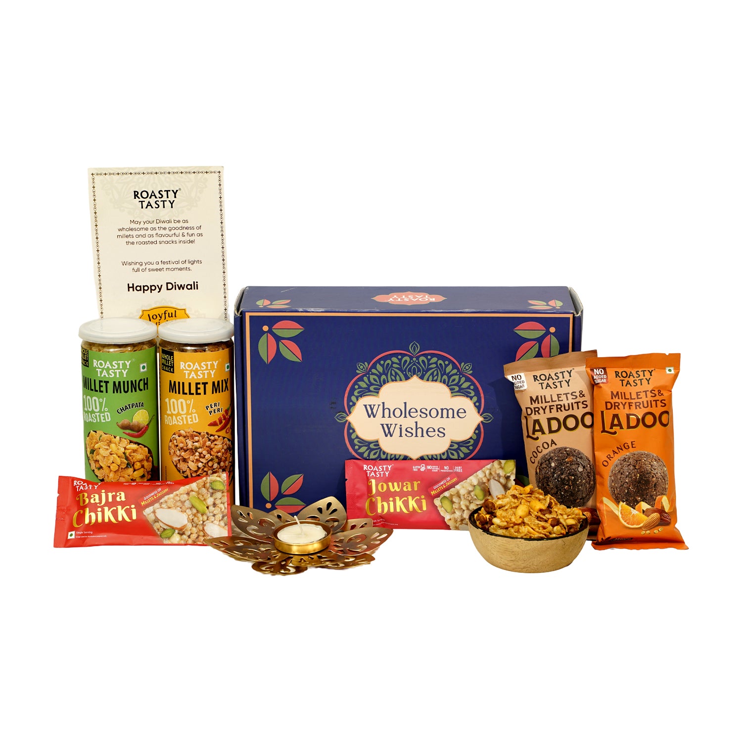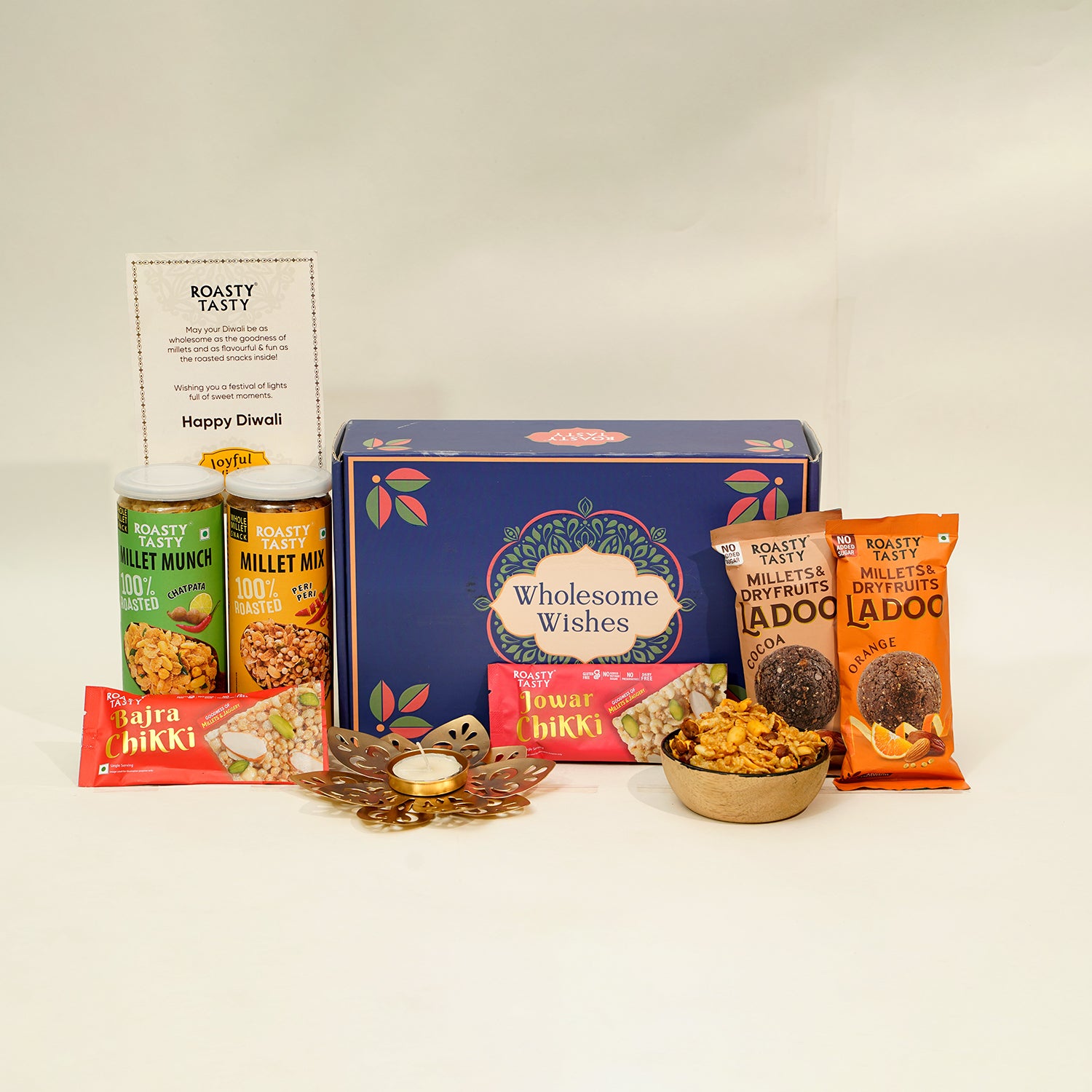 8 Premium Inclusions - A festive hamper with 8 thoughtfully curated items including roasted snacks, no added sugar ladoos, millet chikkis & diya stand & greeting card.