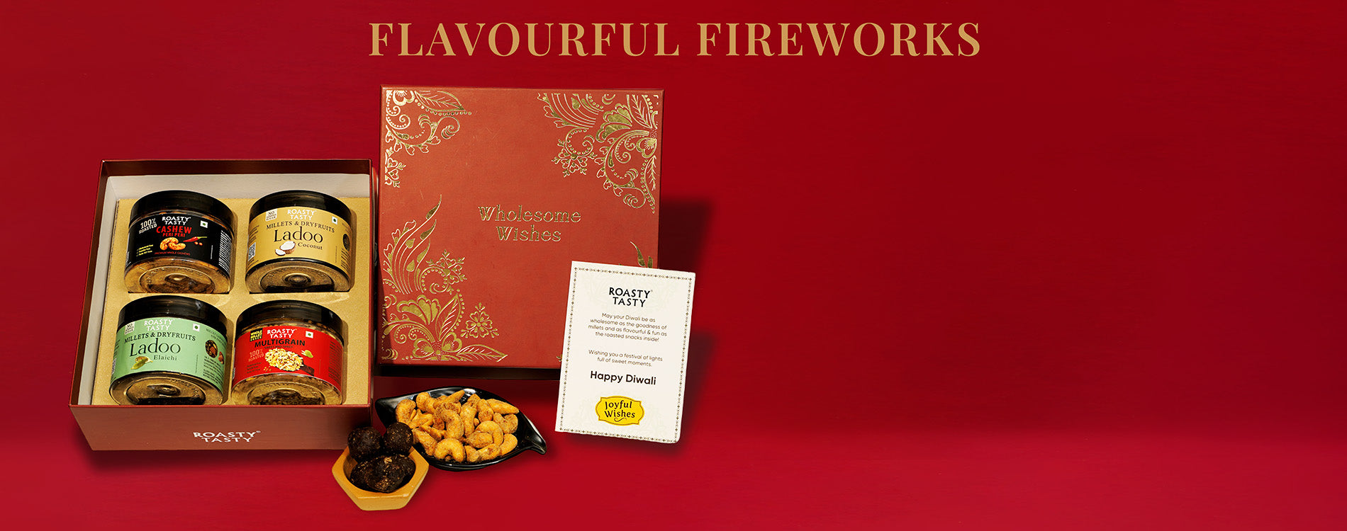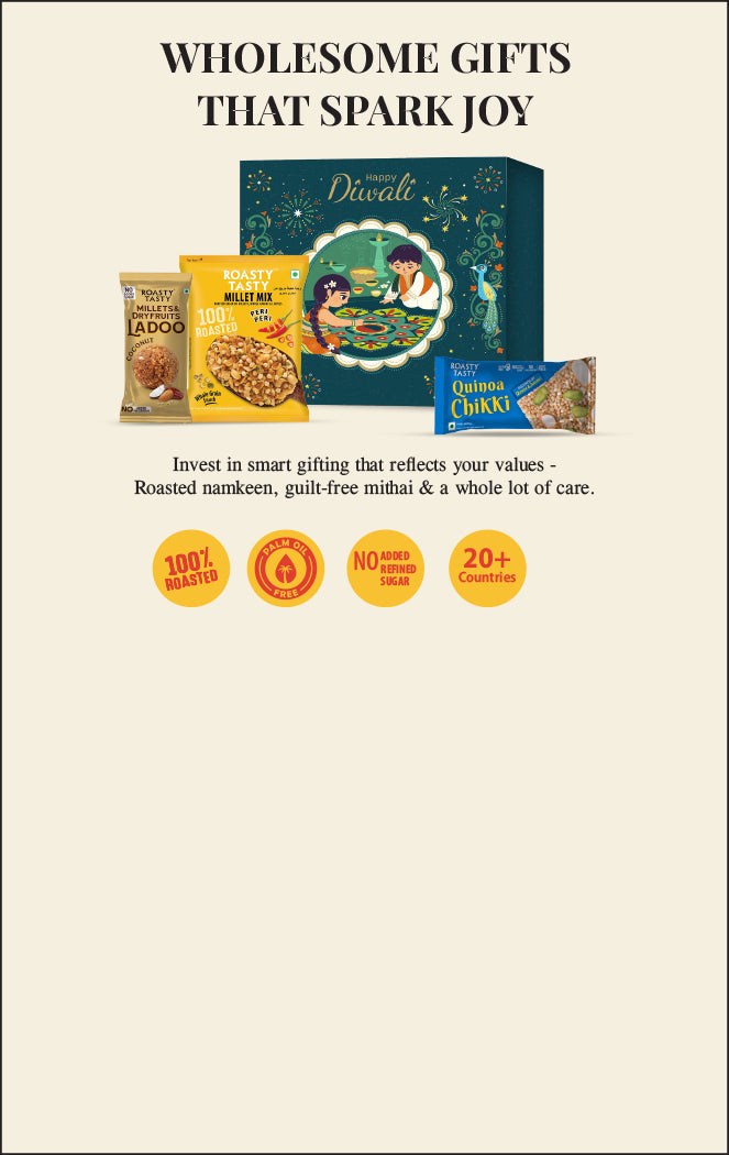 This Diwali, go beyond the usual sweets and fried namkeens. Light up the season with gifts that sparkle - our hampers are filled with palm-oil-free 100% roasted snacks, millet chikkis, and no-added-sugar sweets — indulgent yet mindful, festive yet wholesome.Perfect for clients, employees, and loved ones, each box reflects thoughtful care and better choices, making celebrations truly memorable.